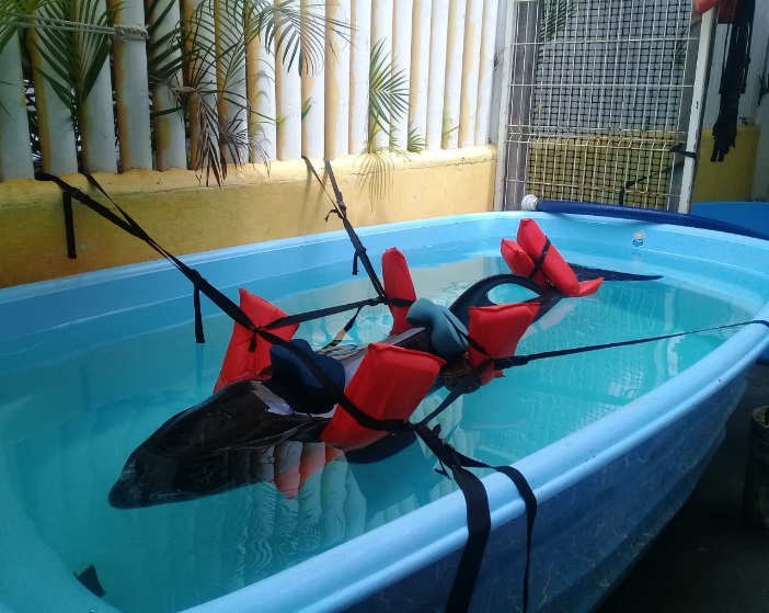 El animal se encuentra en rehabilitación en una tina con flotadores y se le proporciona una alimentación adecuada, que está controlada por medio de una sonda.