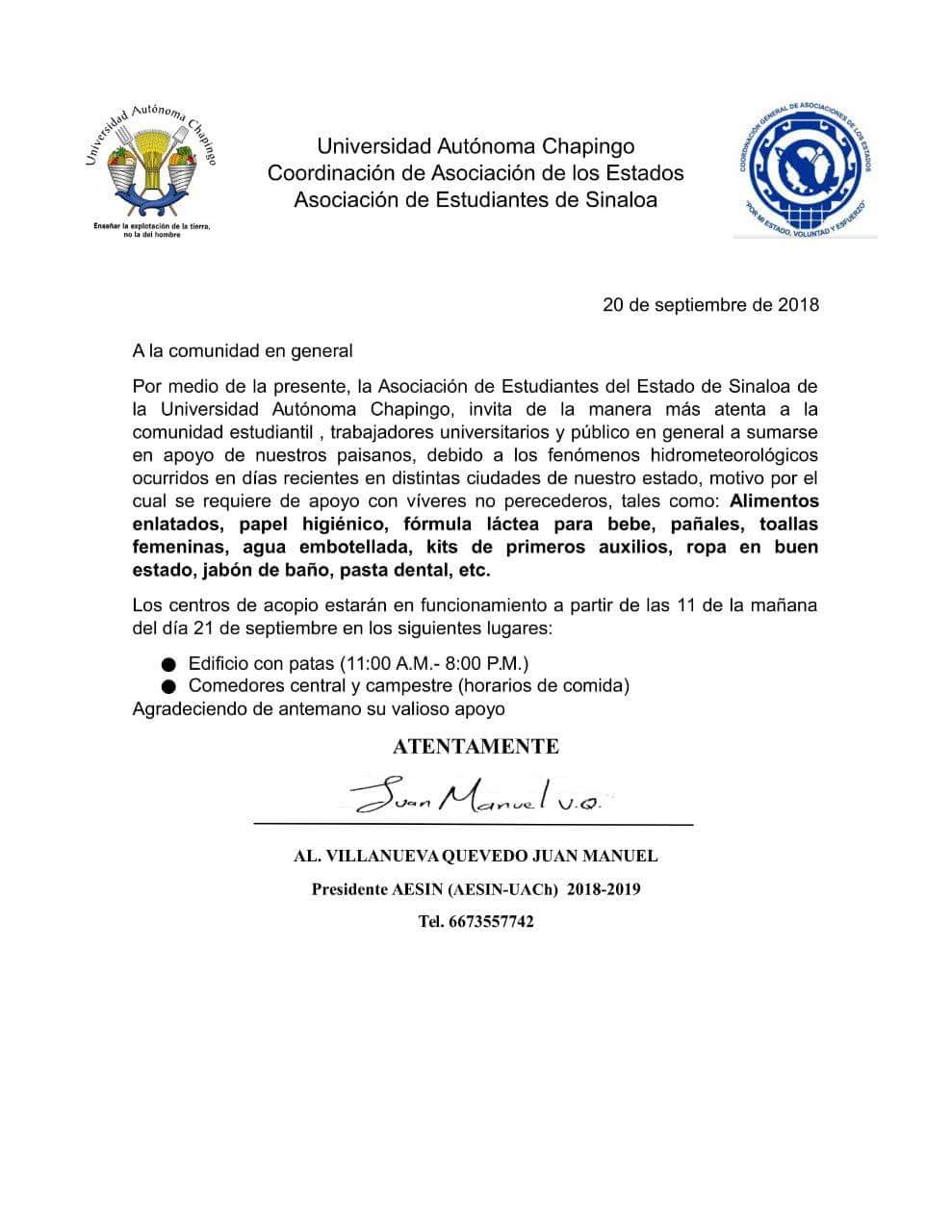La ayuda puede ser entregada de 11:00 a 20:00 horas en el Comedor central y campestre de la universidad, en Texcoco, Estado de México.