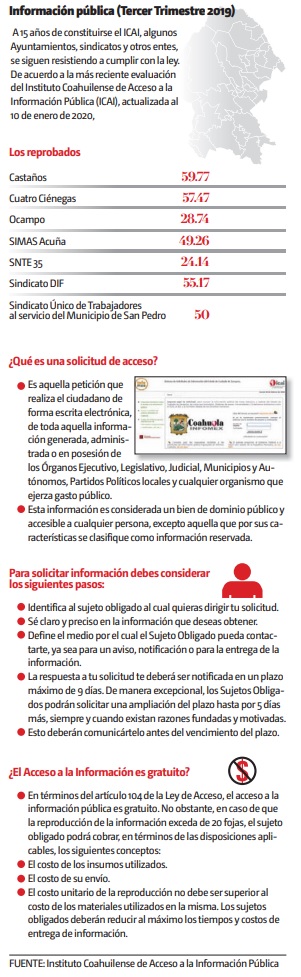 De acuerdo a la más reciente evaluación del Instituto Coahuilense de Acceso a la Información Pública (ICAI), actualizada al 10 de enero de 2020, los municipios de Castaños, Cuatro Ciénegas, Ocampo, así como SIMAS Acuña, la Sección 35 del SNTE y el Sindicato del DIF, incumplen con la información mínima pública al ser evaluados con menos de 70 puntos, el más bajo con 24.