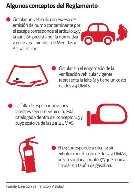 La falta de espejo retrovisor y laterales según el vehículo, por su parte, está catalogado dentro del concepto 145 y cuyo costo va de las dos a 4 UMAS. El 173 corresponde a circular sin extintor con el costo de 2 a 4 UMAS, precio similar al punto 175 que marca circular sin tapón de gasolina.