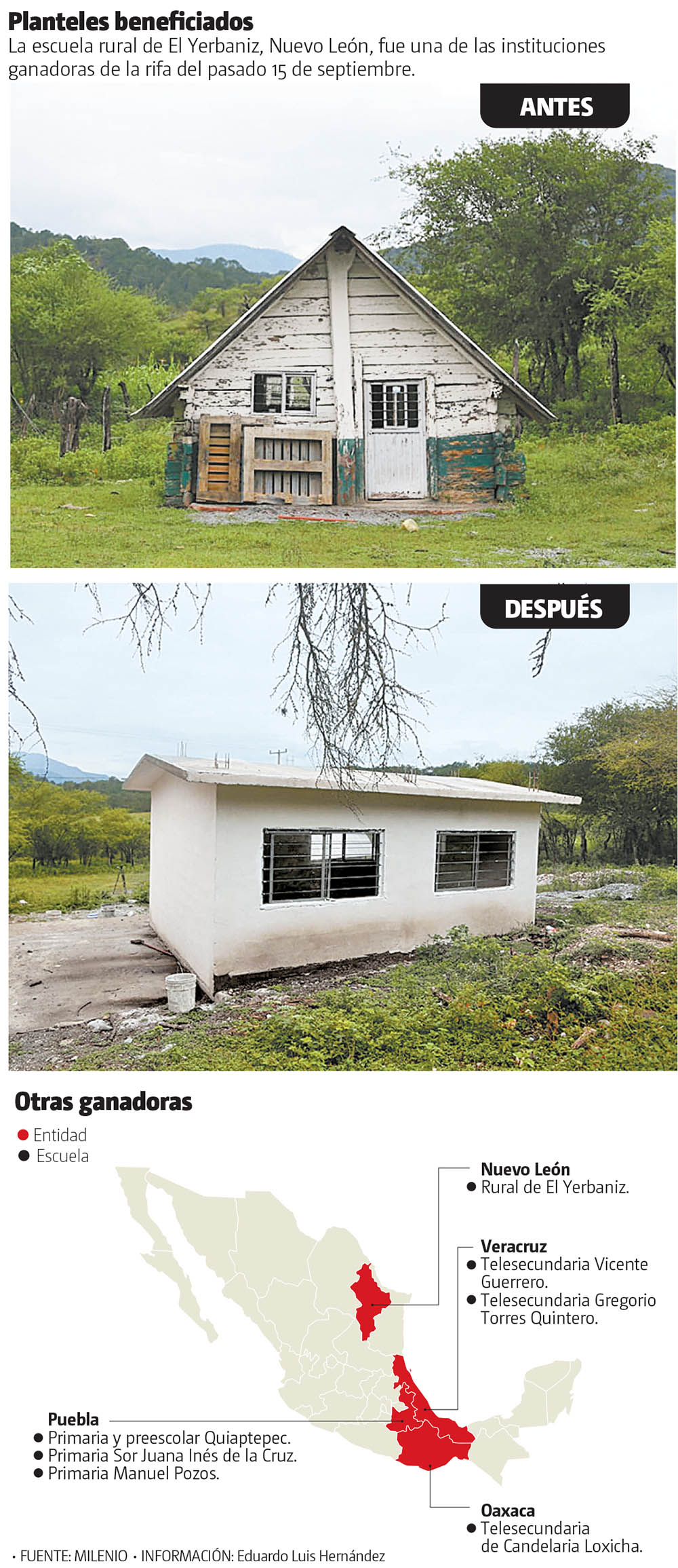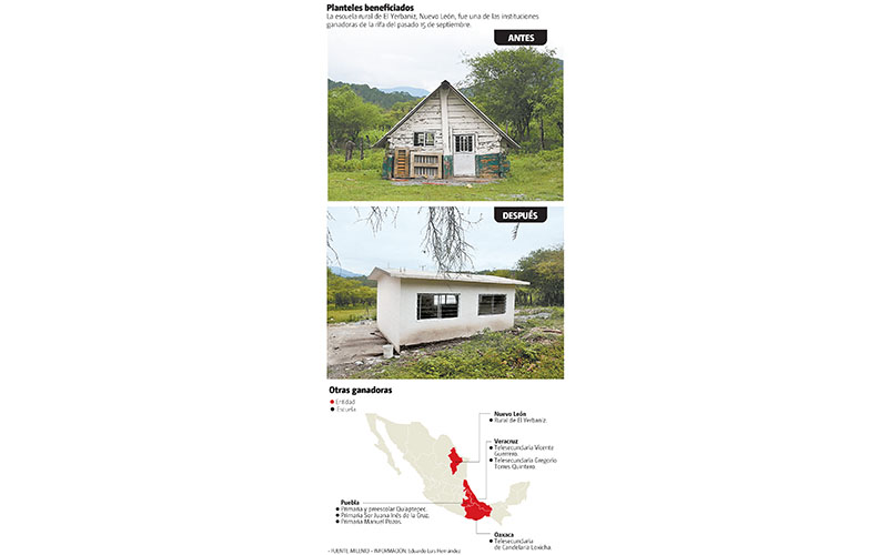 La escuela rural Gustavo Díaz Ordaz, que durante 65 años recibió a sus alumnos en una pequeña choza a casi 40 kilómetros de la cabecera municipal de Aramberri, Nuevo León, salió del anonimato este 15 de septiembre cuando uno de los ocho boletos de lotería donados por Grupo Vidanta, que dirige Daniel Chávez Morán, resultó ganador de uno de los premios de 20 millones de pesos que repartió el sorteo del avión presidencial.