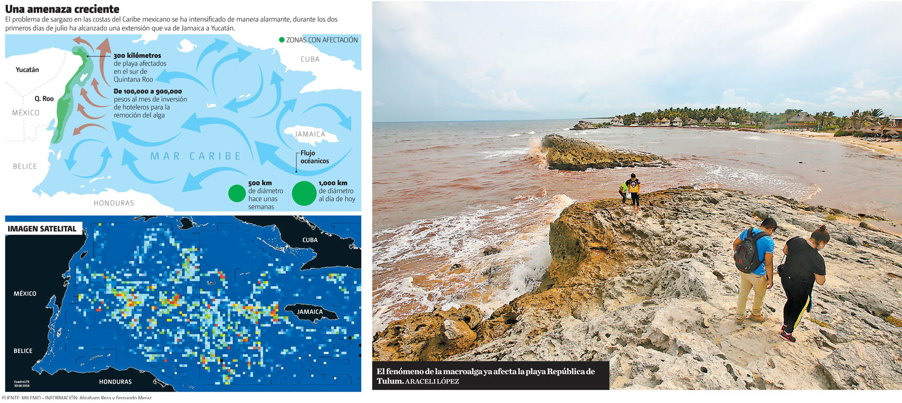 El impacto es mayor de lo que se había pronosticado, pues la mancha que hasta hace una semana tenía 500 kilómetros de diámetro hoy ya alcanza los mil. Es decir, prácticamente toda el agua que hay entre la Isla de Jamaica y la Península de Yucatán están cubiertas por el alga.