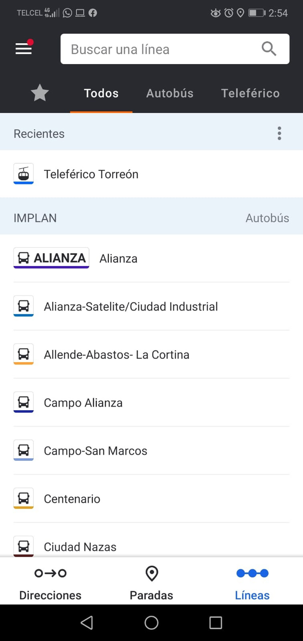 En el apartado de 'líneas', están los nombres de todas las rutas de camiones disponibles en la ciudad por si deseas buscar una en especifico, incluso, incluye el Teleférico de Torreón.