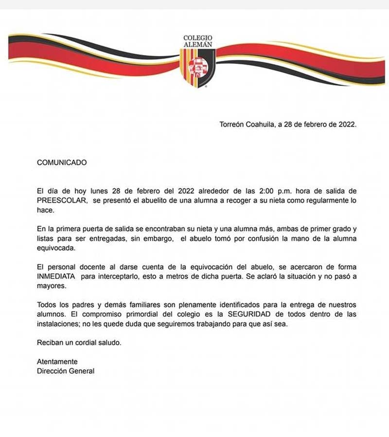 En el comunicado se da a conocer que el lunes 28 de febrero a la hora de salida del preescolar, alrededor de las 2:00 de la tarde, hubo una confusión momentánea, pues acudió al instituto un "abuelito" a recoger a su nieta, como habitualmente lo hace, aseguran.