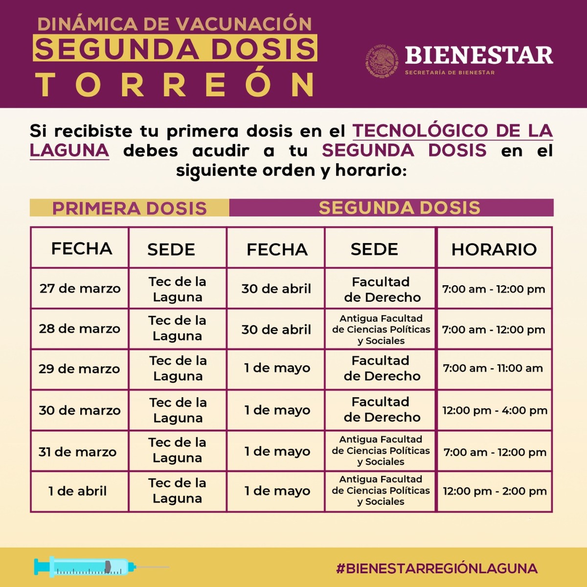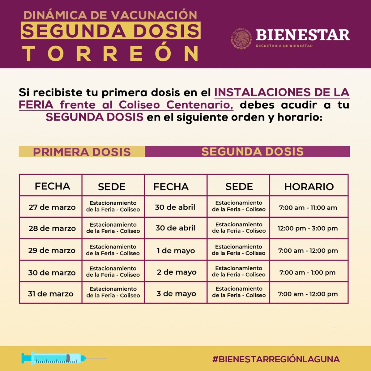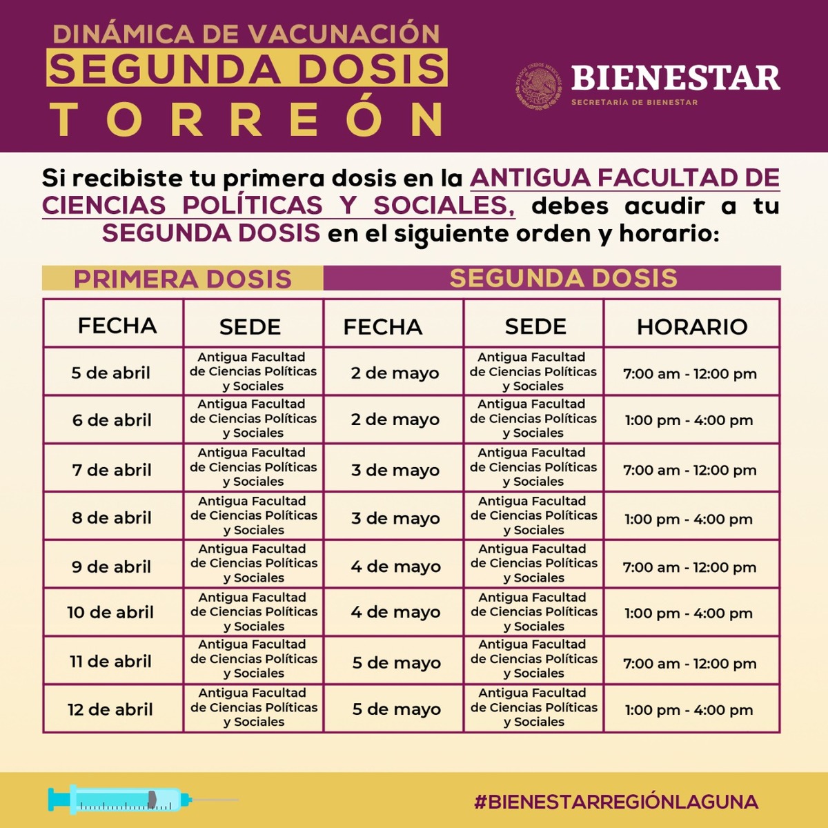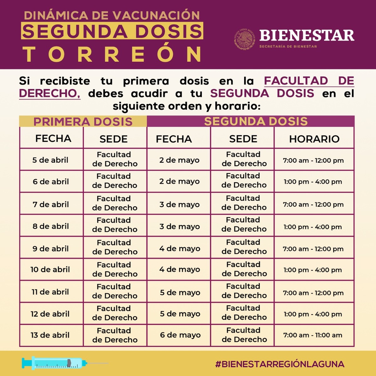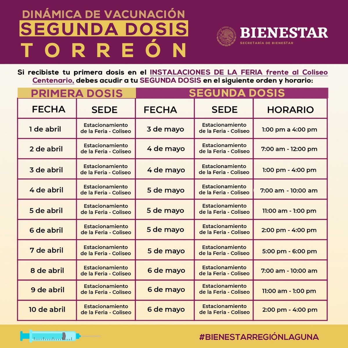 Se proyecta para los días 30 de abril al 6 de mayo y el día se definirá en base a la fecha en la que se aplicó la primera dosis.