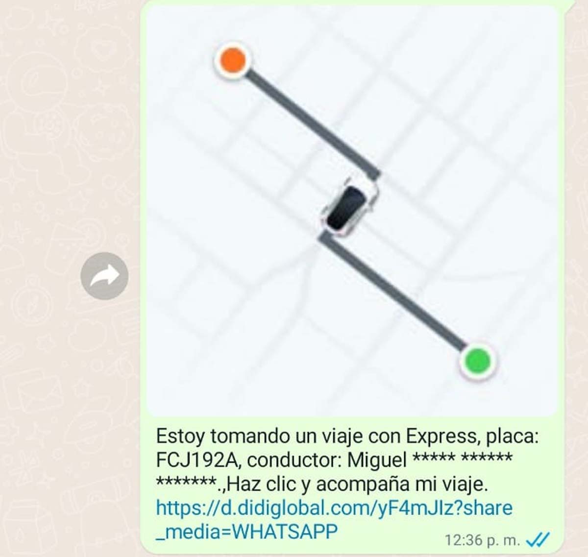 Por su parte en la plataforma de Didi las opciones son muy similares ya que también cuenta con la configuración de enviar el viaje y la información del conductor a tus contactos en el que se leerá el mensaje "Estoy tomando un viaje (placas del auto y nombre del conductor)", acompañado de un link que te direcciona a un mapa con la ubicación actual del vehículo.