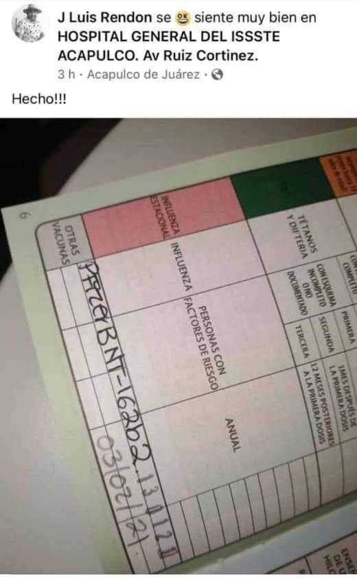 La publicación del carnet de seguridad social, la hizo el propio José Luis Rendón Juárez el miércoles, aunque más tarde bajó la foto de su perfil de Facebook, además de una captura de pantalla donde confirma haber sido vacunado en el instituto.