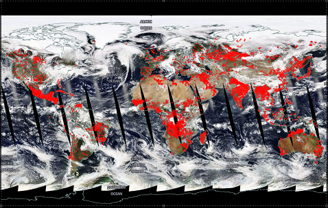 Con puntos rojos, el mapa muestra los focos de calor que son detectados por los satélites de la NASA.