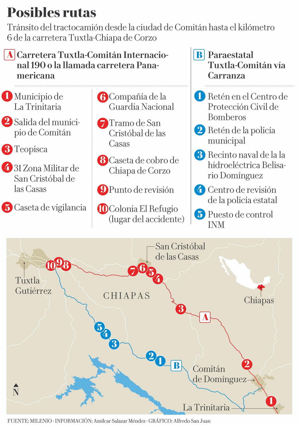 MILENIO realizó un recorrido por las dos posibles rutas por las que pudo haber transitado el tracto camión desde la ciudad de Comitán hasta el kilómetro seis de la carretera Tuxtla- Chiapa de Corzo, documentando que sobre la paraestatal Tuxtla- Comitán vía Carranza y la carretera Tuxtla-Comitán Internacional 190 o la llamada carretera panamericana, por lo menos existe presencia policial en 14 puntos; dos retenes de la policía estatal, dos puestos de control del Instituto Nacional de Migración, un recinto naval, tres retenes municipales, dos puestos de control del Ejército Mexicano, una región militar, un cuartel de la Guardia Nacional, una caseta de cobro y una caseta de vigilancia abandonada de la otrora Policía Federal.