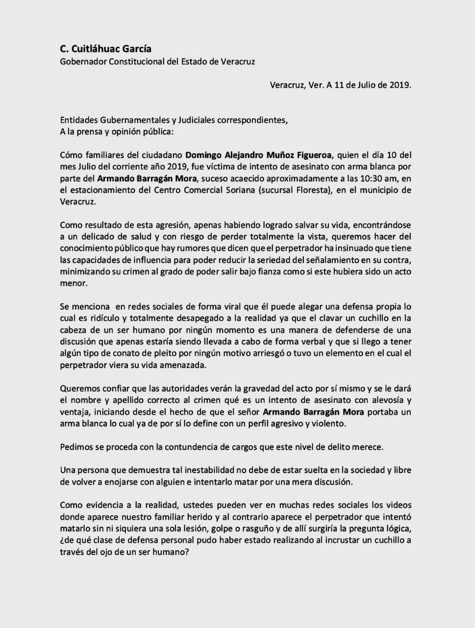 En documento que envían al gobernador Cuitláhuac García Jiménez solicitan que Armando "N" sea castigado por intento de asesinato con arma blanca y no salga libre bajo fianza alegando defensa propia.