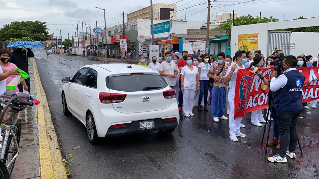 Personal médico, enfermeras y servicios en general bloquearon la avenida Cuauhtémoc, a una cuadra de donde se ubican el Centro Médico y el Hospital General de Zona 57 del IMSS en la ciudad de Veracruz.