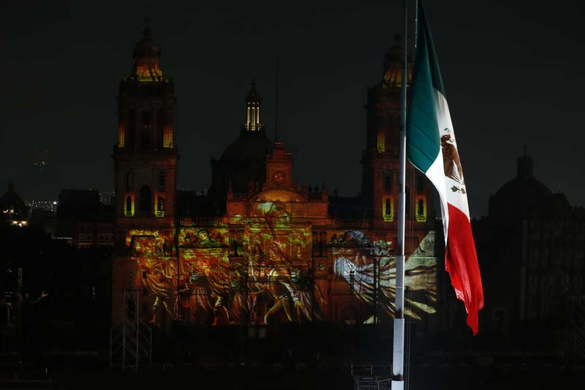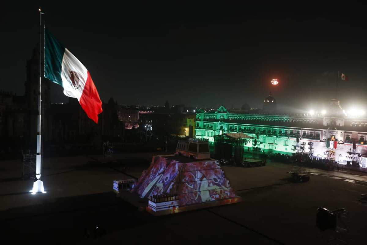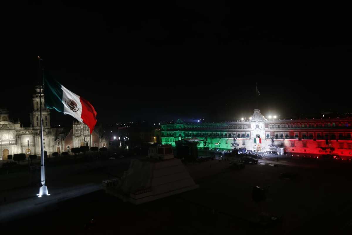 Durante la noche, el Zócalo se iluminó de verde, blanco y rojo y muchos colores más; este año la decoración incluyó elementos del México prehispánico.
