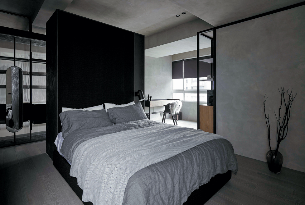 El clóset se encuentra totalmente abierto, teniendo la doble función de servir como muro de respaldo para la cama y también como organizador de la recámara.
