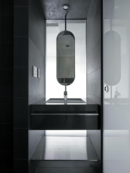 Respecto a la selección de materiales, el tono base es la textura aparente del concreto, que se acompaña con un recubrimiento especial de pintura negra en diversas aplicaciones, presentando una gama cromática oscura a través de varias capas, las cuales se contrastan con tonalidades de madera en muebles y algunos detalles de color. En la misma sintonía, la cocina fue diseñada con paneles de madera y entrepaños de acero inoxidable.
