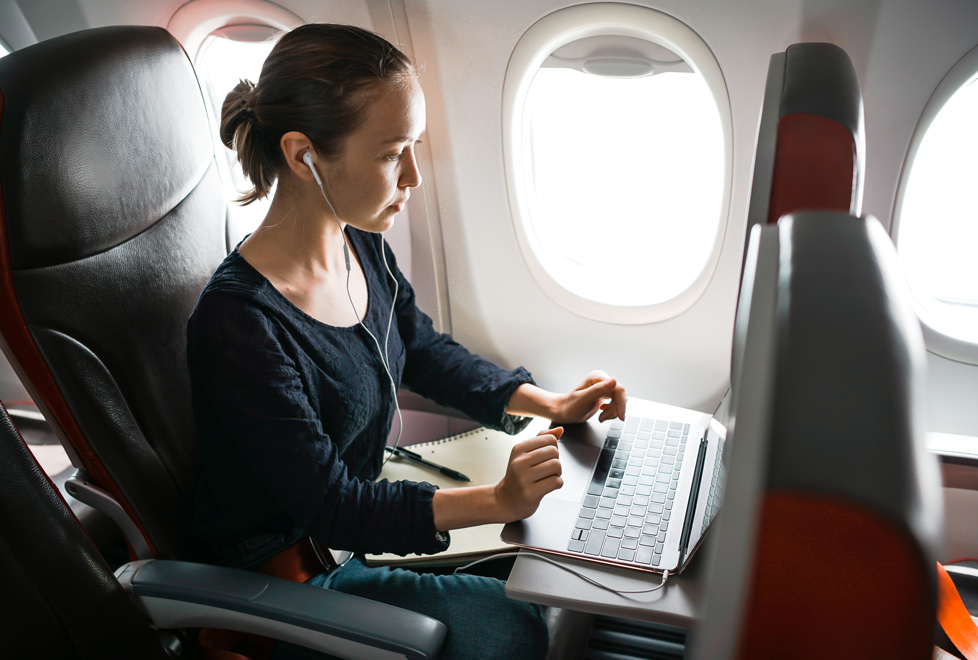 Esta pasajera también saca su laptop y abre la tapa en el momento en que estamos en el aire. Esa es la última vez que levanta la cabeza. Golpea su teclado durante todo el vuelo. Aparecen las hojas de cálculo, las gráficas de barras y el texto, da clic para enviarlas, regresan y se revisan.