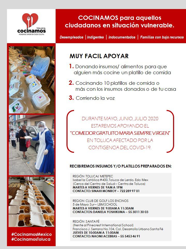 Inicialmente CocinamosToluca, proyecto impulsado por Daniela Yoshikuma, apoyará al comedor de la Comunidad Apostólica “María Siempre Virgen”, localizado en el centro de Toluca, donde las hermanas religiosas, desde hace 12 años, cocinan a las comunidades vulnerables. Antes de la contingencia el comedor beneficiaba a más de 400 personas; con el impacto del covid-19 solo pueden alimentar a 20 personas.