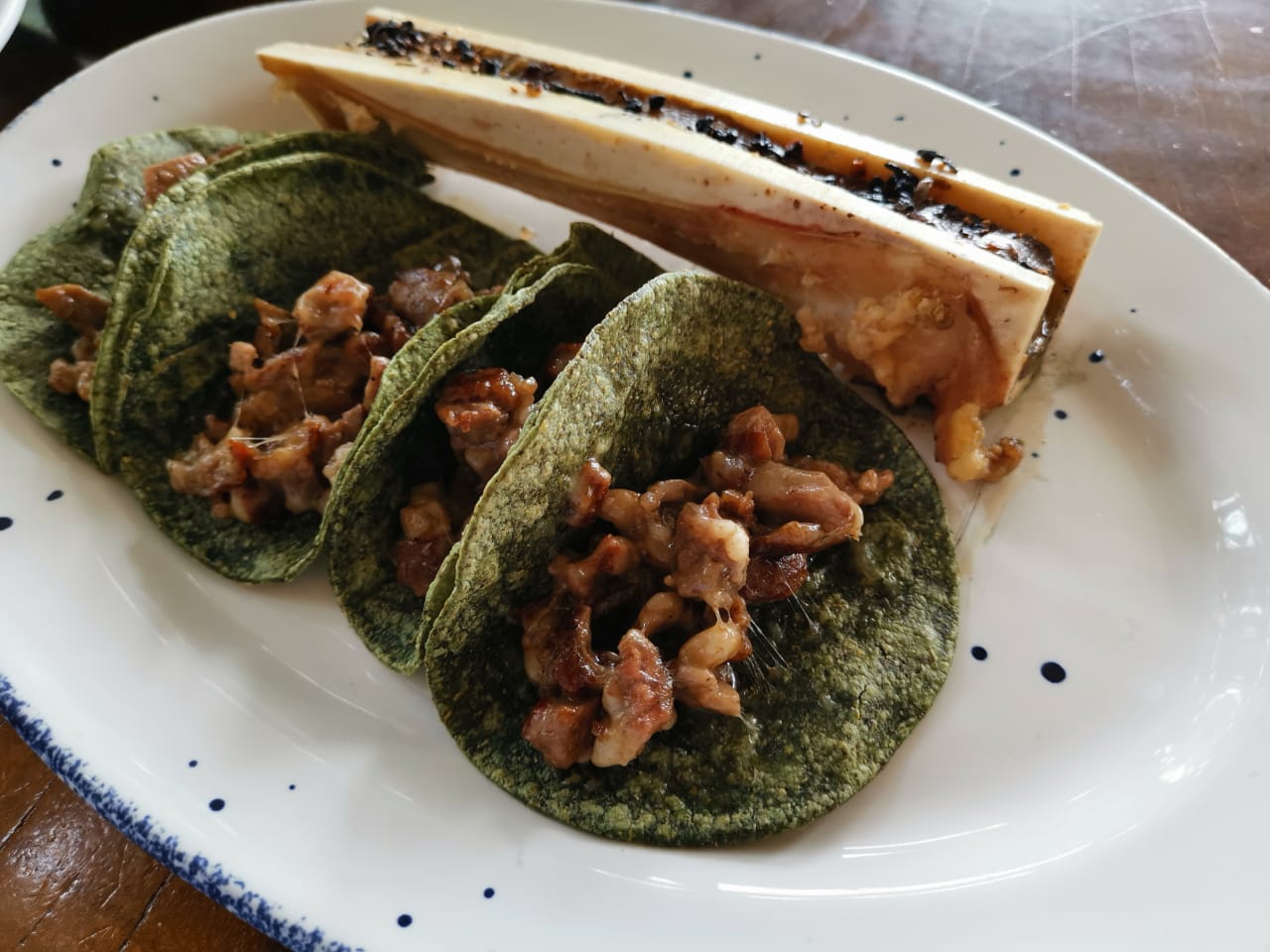 Después de la tostada, llegaron unos tacos de Rib Eye gratinados que, si amas la carne, no podrás perderte. Están servidos en tortillas de harina, pero si gustas, puedes ordenarlos en tortillas de maíz. Lo mejor de todo, es que cuentan con un tuétano como guarnición.
