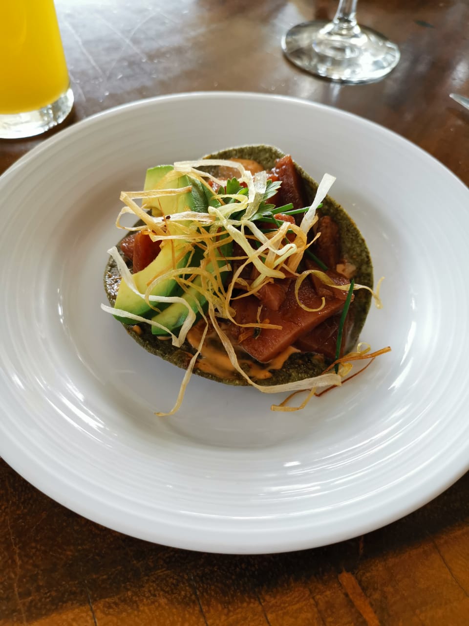 El primer plato fue una tostada de atún, hecha con maíz azul y servida con mayonesa de chipotle que contrasta con el sabor del pescado. Esta entrada es uno de los platillos favoritos y es excelente para abrir el apetito.