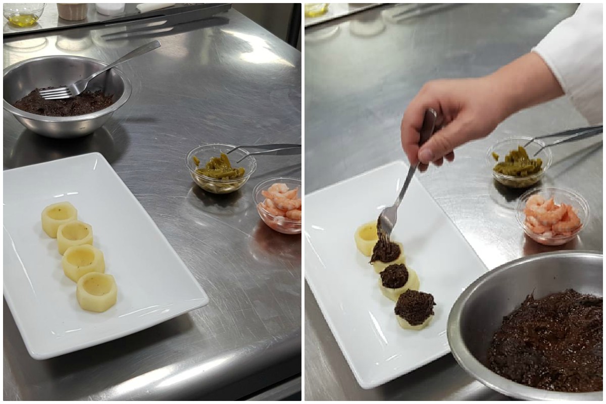 Cocer las papas y después cortarlas a la mitad para hacerles un agujero que será rellenado con los romeritos previamente preparados.