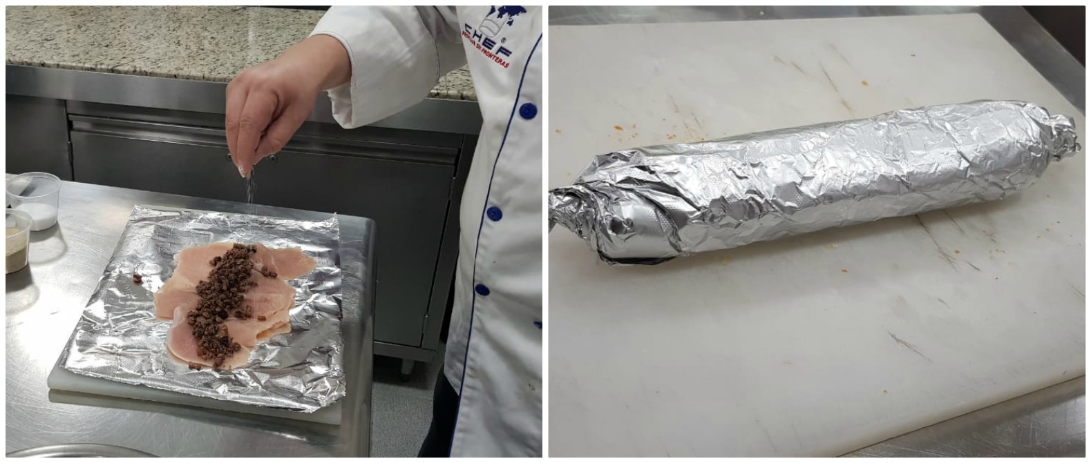 Una vez que tengas tu relleno listo, colócalo sobre la pechuga de pavo que posteriormente enrollaras con papel aluminio. Asegúrate de que las puntas queden bien enrolladas para después meterlo al horno durante 20 minutos.