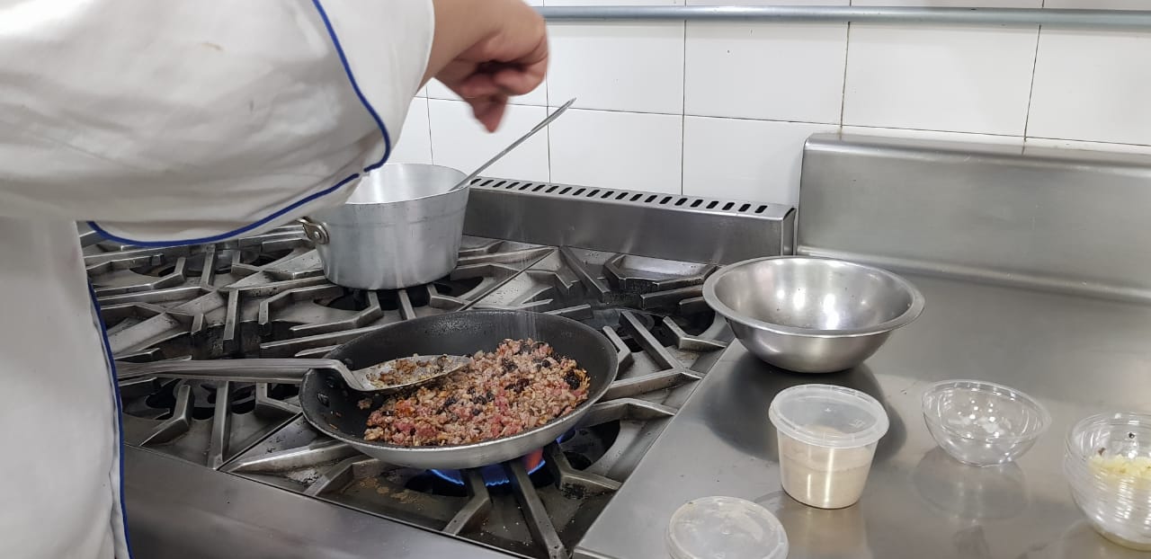 A continuación, agrega la carne de filete de res, que deberá estar picada finamente para que se cueza. Mientras la carne está en el sartén, sazónala con un poco de sal y pimienta. Es importante mover todo el tiempo la preparación para que la carne se selle y no se desjugue; de esa manera se mantendrá suave y no perderá el sabor.