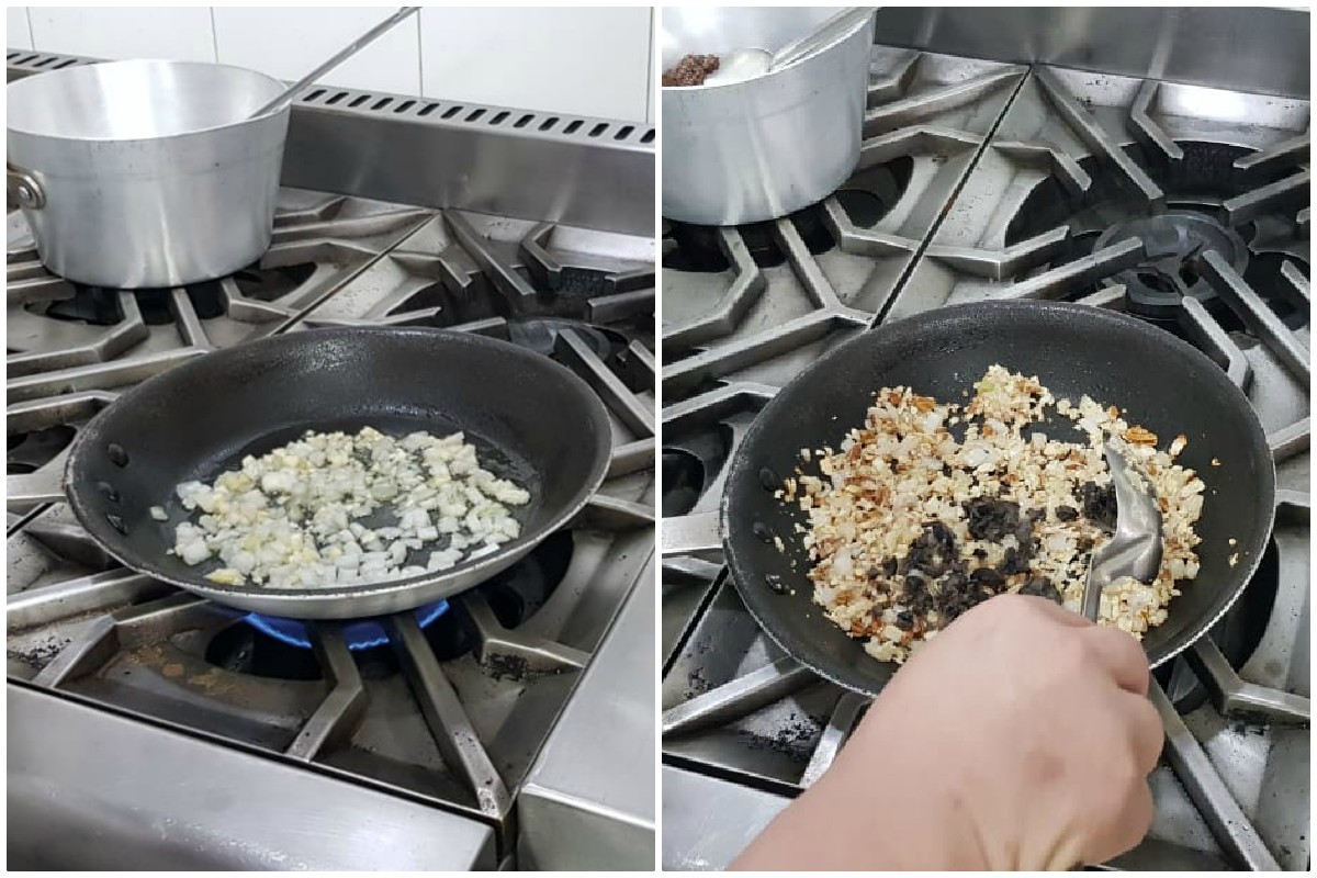Antes que nada se deberá preparar el relleno, por lo que necesitarás poner un poco de aceite de oliva en un sartén caliente. Después deberás agregar la cebolla y el ajo para que se vaya cocinando a fuego alto hasta que la cebolla quede de un color transparente y el ajo dorado.