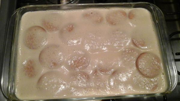 Abre las galletas y, en el refractario, comienza a preparar una cama con ellas, que queden bien juntitas. Luego, vierte un poco de la crema que preparastesobre ellas y repite hasta que se acaben las galletas. La última capa debe ser de crema.