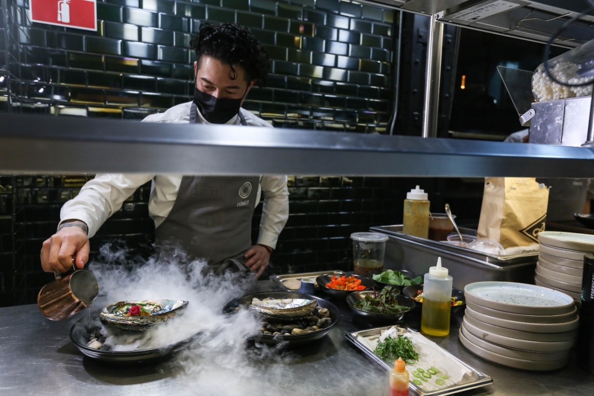 Mientras el chef prepara el primer platillo en su cocina, explica: “Uno de los platillos estrellas de Fónico es un abulón del Pacífico, que va servido con un rasurado de pimiento rojo, un poquito de salsa de soya, jugo de limón aguacate y, lel abulón ligeramente marinado”, explica, y pone hielo seco en el platillo para una presentación perfecta.