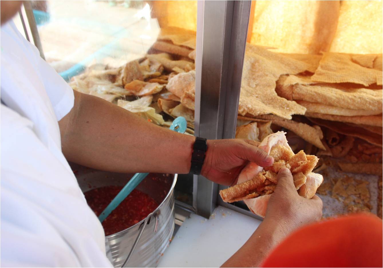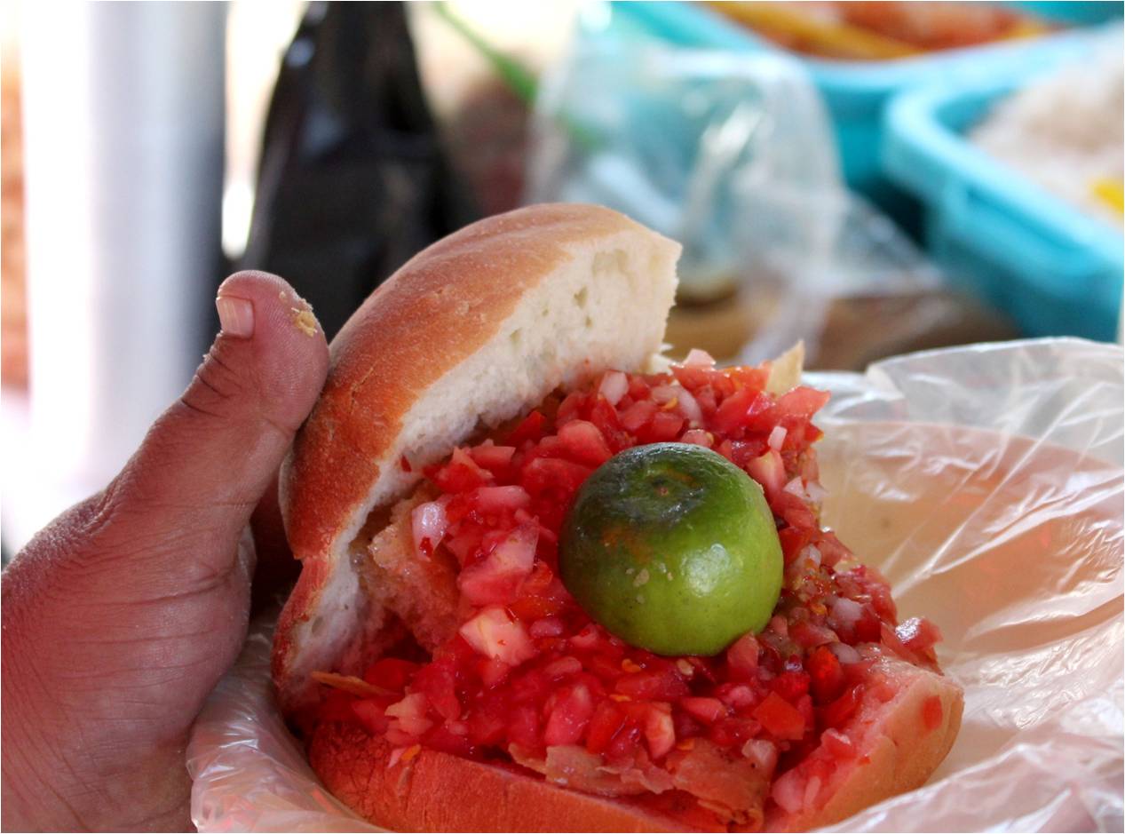 Bolillo suavecito, esponjoso, que abrimos por la mitad de un solo costado, con trocitos de duro o chicharrón de cerdo que resuenan en un "crunch" cuando son colocados estratégicamente al interior del bolillo como relleno; servirle después picosita salta de jitomate tipo pico de gallo, bien sazonada, por supuesto; su aguacatito, por eso de las grasas saludables; ¿y por qué no? pedacitos de cueritos encurtidos, para rematar finalmente con un poco de limón y sal al gusto...