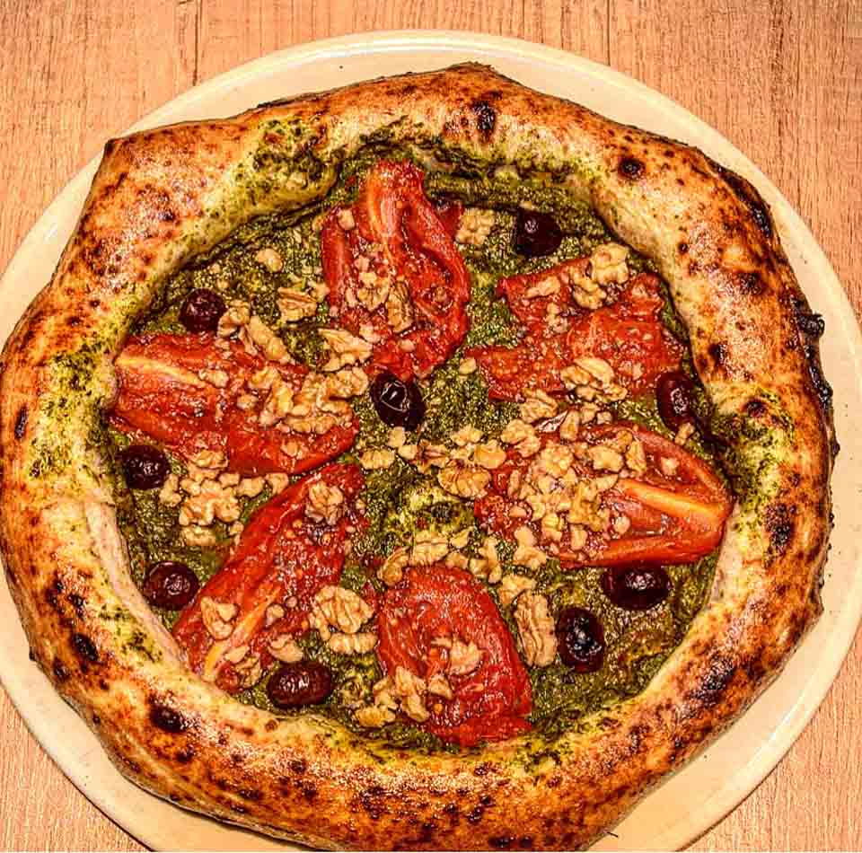 La base de la pizza está hecha con harina de trigo y está cubierta con jitomates cherry, aceitunas negras, nabos, nueces, aceite de oliva extra virgen, ajo y pimiento.