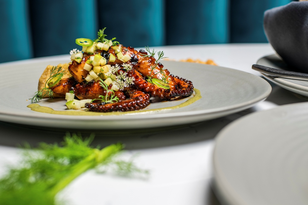 Este estofado incluye pulpo fresco y garbanzos, y se adereza con aioli y hierbas frescas. Se sirve con piña y se decora con rodajas de chile habanero.