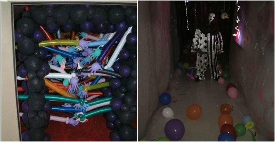 Podrías aprovecharlos para crear un laberinto en algún pasillo o entrada. con globos largos y guantes de látex estos podrían simular brazos o, como los payasos están de moda, disfrazarte de uno y colgar varios globos rojos, como en It, del techo.