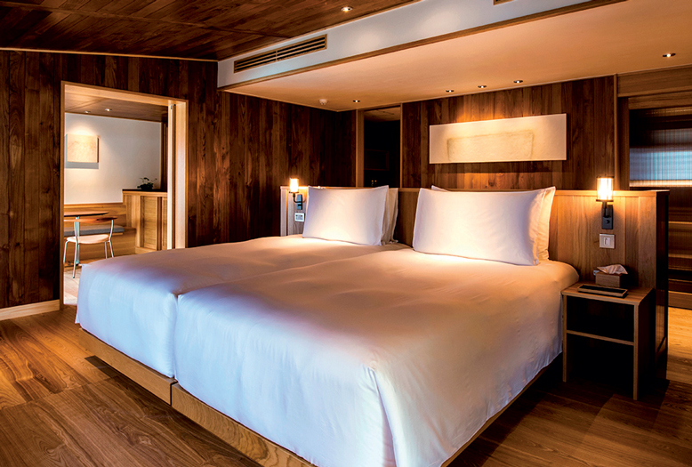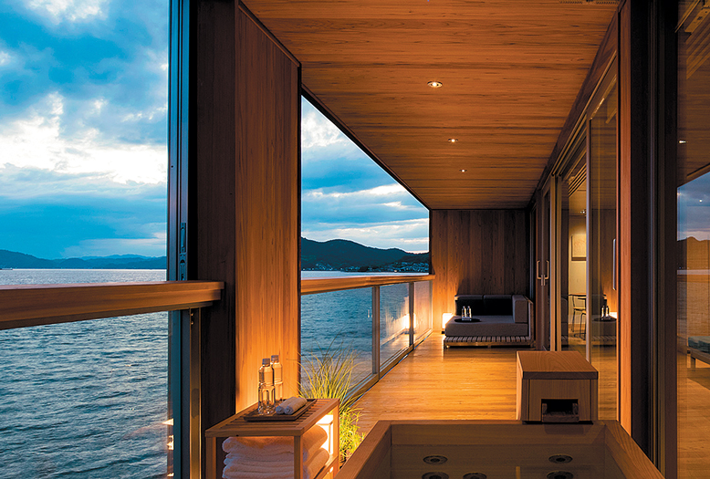 El tiempo pasa lentamente a bordo, envuelto en la fragancia de la madera. Cuando entras a tu cabina, las vistas del mar interior de Seto se extienden ante tus ojos junto a las crestas de múltiples capas de las montañas. Guntû ofrece cuatro tipos de cabinas de pasajeros, todas son suites con terrazas cerca de la superficie del mar.
