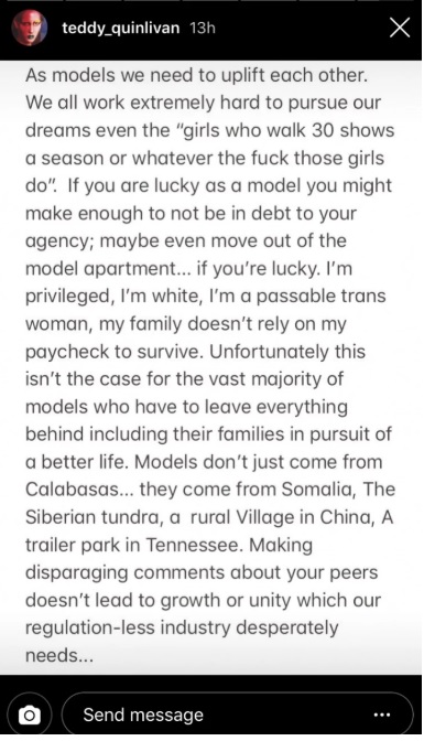 Teddy Quinlivan, una de las modelos trans más reconocidas del momento, también escribió en respuesta a lo dicho por Jenner y aseguró que si una modelo tiene suerte, “hará el dinero necesario para pagarle a la agencia[…] Las modelos no sólo vienen de Calabasas –refiriéndose al lugar de residencia de Kendall- también vienen de Somalia, Siberia, un pueblito en China o un remolque de Tennessee”.