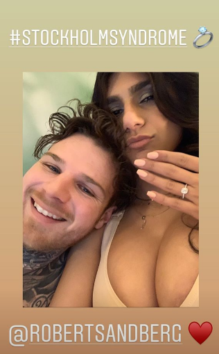 A la libanesa Mia Khalifa, ex estrella de cine porno, le encantó su anillo de compromiso, desde hace tres días se hizo oficial que su novio, el chef sueco Robert Sandberg le pidió matrimonio, ante lo que la celebridad del cine para adultos ha reaccionado con fotos del anillo en todo momento.