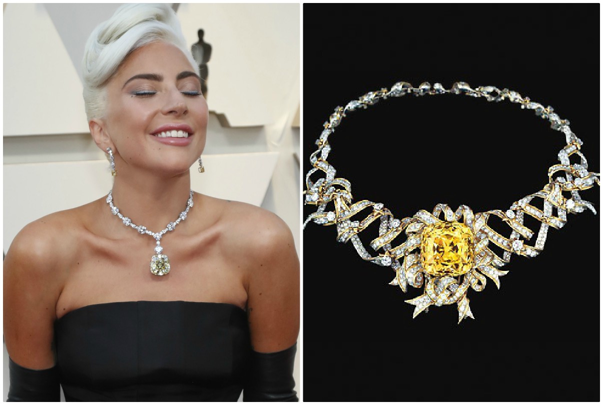El collar, valuado en 30 millones de dólares, es de la casa Tiffany & Co y lleva el nombre de diamante de Tiffany. La piedra que lleva fue encontrada en las minas Kimberley de Sudáfrica en 1877.