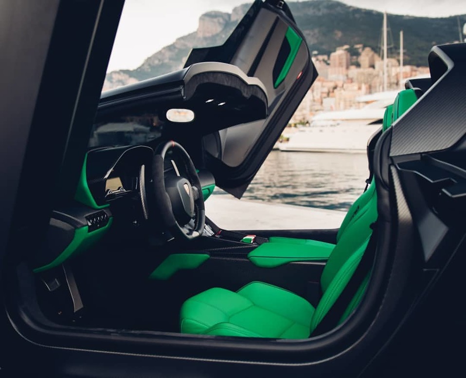 El verde se encuentra también presente al interior del auto, adornando la tapicería, y en donde se combina con cuero negro y la fibra de carbono que reviste el volante. Es capaz de llegar de 0 a 100 kilómetros por hora en solo 2.9 segundos y alcanzar una velocidad máxima de 355 kilómetros por hora.