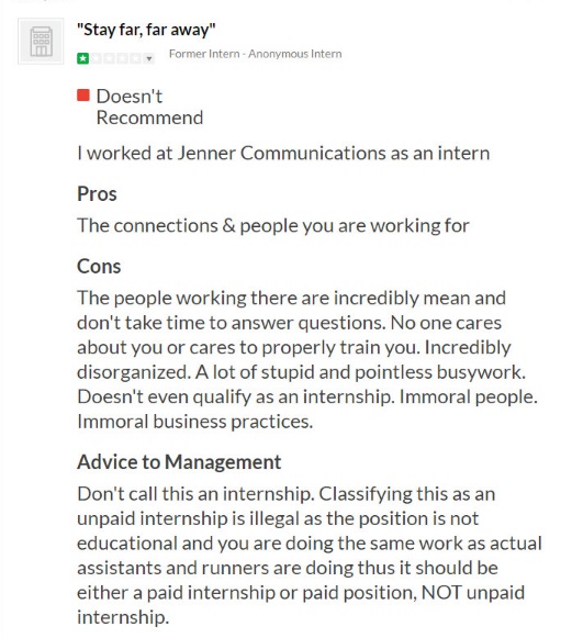 Algunas personas que estuvieron previamente en ese puesto compartieron sus experiencias y dijeron que pese a trabajar de cerca con las Kardashians, no recomiendan trabajar ahí, ya que el trato del personal era pésimo y no ofrecían ninguna experiencia valiosa para un futuro empleo.
