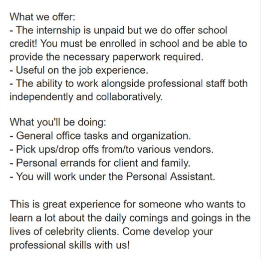 Pareciera ser una gran oportunidad para crecer, ya que aunque no pagan con dinero, sí dan créditos escolares y tendrías la oportunidad de estar cerca de las celebridades. El problema es que al ver las funciones que deberías cumplir, es fácil cuestionarse cómo ese puesto te ayudaría a crecer profesionalmente.
