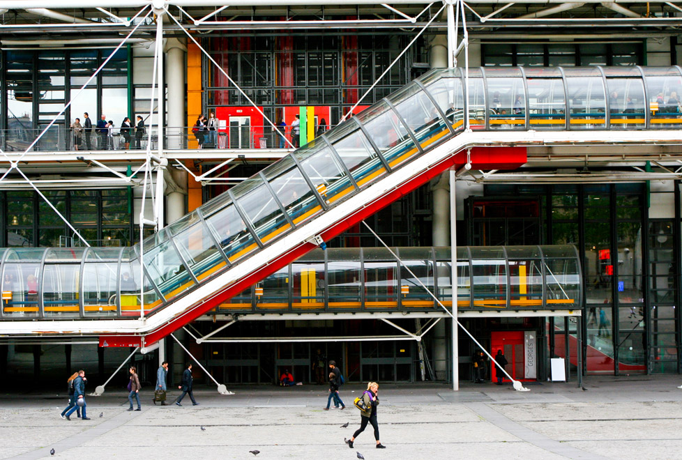 Diseñado por los arquitectos Renzo Piano y Richard Rogers hace 40 años, con su innovadora propuesta de "diagrama espacial evolutivo", el Centro Pompidou marcó el parte aguas para una nueva generación de museos y centros culturales en el mundo. El edificio cuenta con una estructura visible, muy novedosa para la época de los 70, que deja a la vista los techos, las tuberías y el cableado en colores llamativos. En su interior alberga una colección incomparable de arte moderno y contemporáneo, con más de 100 mil obras maestras de artistas como Henri Matisse, Robert Delaunay, Georges Braque, Pablo Picasso, René Magritte, Piet Mondrian y Jackson Pollock, entre otros.