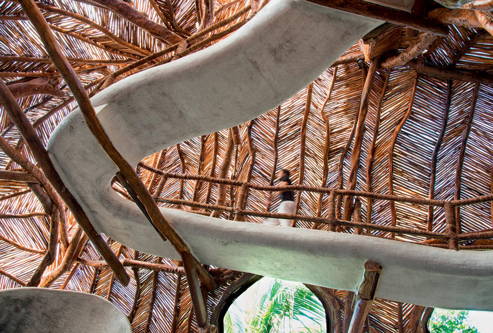 El hotel Azulik está dedicado al turismo sustentable y de lujo, perfecto para amantes de la naturaleza. Es aquí donde se encuentra IK LAB, una galería como ninguna otra que aspira a convertirse en un recinto para que los artistas que interactúen con su arquitectura visionaria. Paredes curvas, pisos ondulados, ventanas circulares y vegetación que brota de cada superficie, le dan un toque surrealista a la galería que es una obra de arte en sí misma.