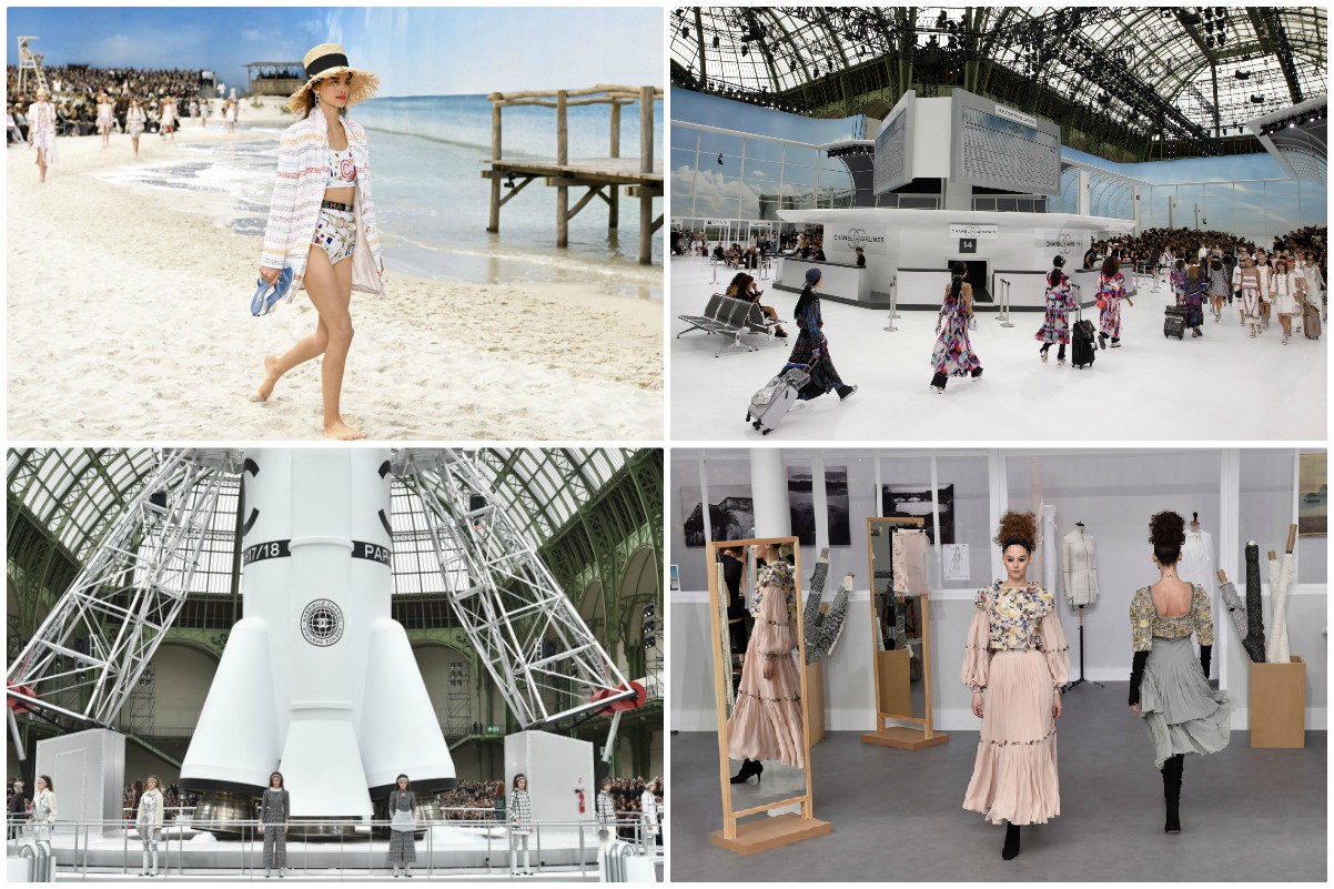 Otra de las facetas del diseñador era la ambientación y resignificación de lugares. De esta forma, convirtió al Gran Palais de París, en donde cada dos años presentaba sus colecciones para Chanel, en una plataforma de lanzamiento de cohetes, una terminal de aeropuerto, un taller de costureras y hasta una playa.