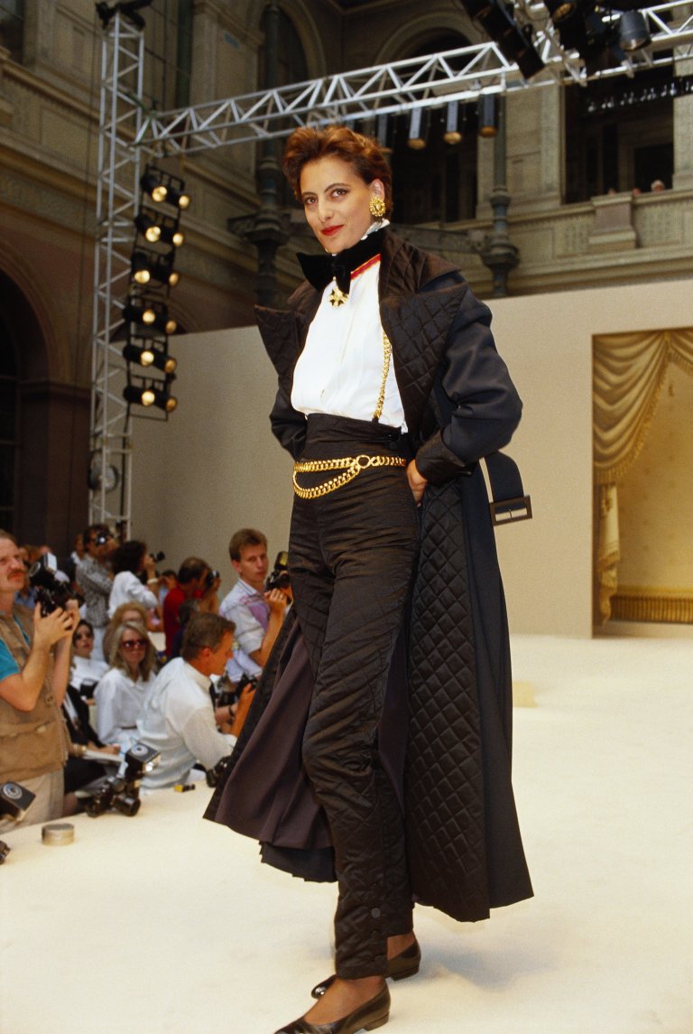 Así como presentaba diseños elegantes que iban con la línea de Chanel, también proponía looks más arriesgados con toques urbanos y atrevidos, como éste que portó Cindy Crawford en 1994.