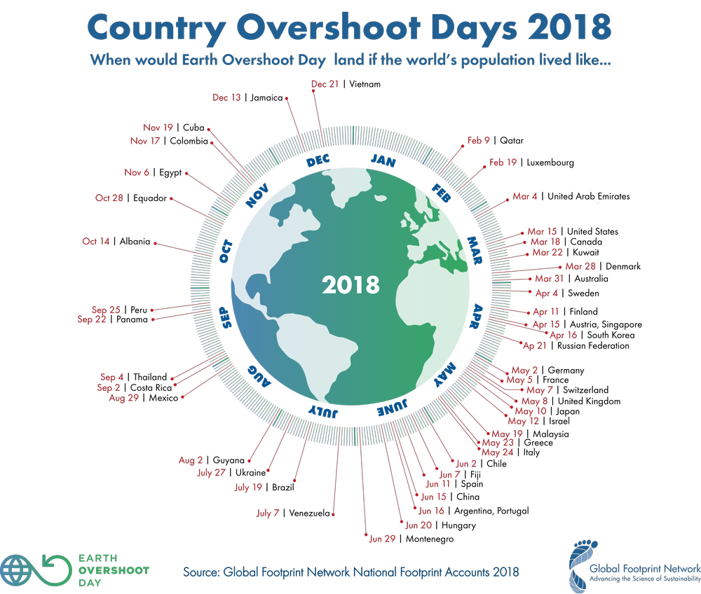 Si el conjunto de la humanidad viviera como lo hacen en esos países, el "Día de Sobrecapacidad de la Tierra" sería el 9 y el 19 de febrero, respectivamente. En cambio, en un país como Vietnam, esta fecha no se produce hasta el 21 de diciembre.