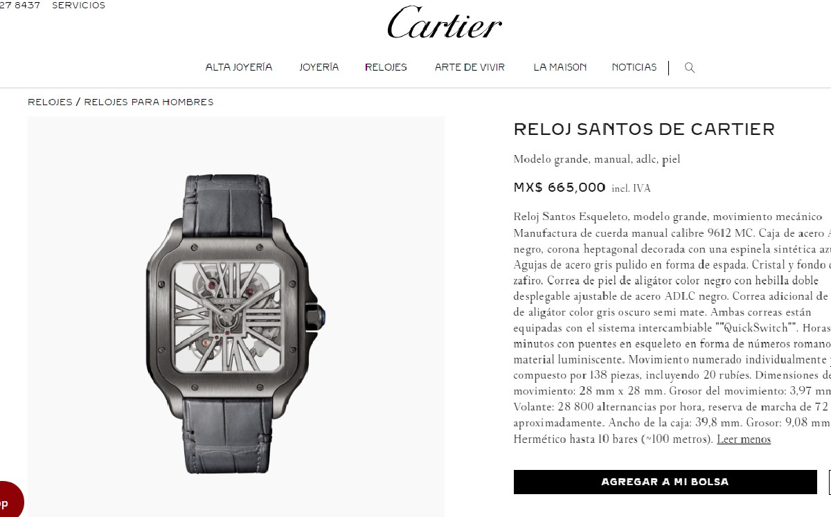 Se trata de un Reloj Santos Esqueleto, modelo grande, movimiento mecánico, cuerda manual, caja de acero negro, corona heptagonal y correa de piel. Además de que está conformado por 138 piezas, entre ellas 20 rubíes.