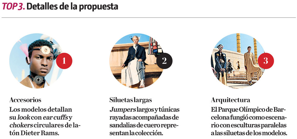 Estos excéntricos tótems, junto con los ear cuffs y los broches de plumas de marabú envueltos en organza aparecen en las imágenes de Mitchel, con la arquitectura del Parque Olímpico de Barcelona como escenario, como esculturas en un juego surrealista a escala que se encuentran paralelos en las siluetas alargadas de la nueva colección.