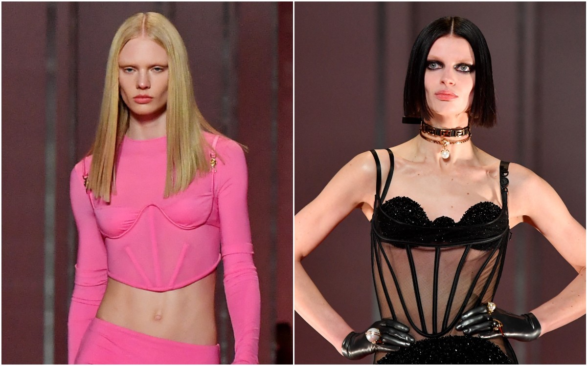 Versace apostó por el máximo contraste con abrigos largos de gran tamaño y hombros anchos en azul pálido y rosa muñeca Barbie, combinados con los característicos tops de la marca en colores contrastados. En Prada, los amplios vestidos negros con hombros generosos se acentuaron con cadenas que atravesaban el escote en ángulo.