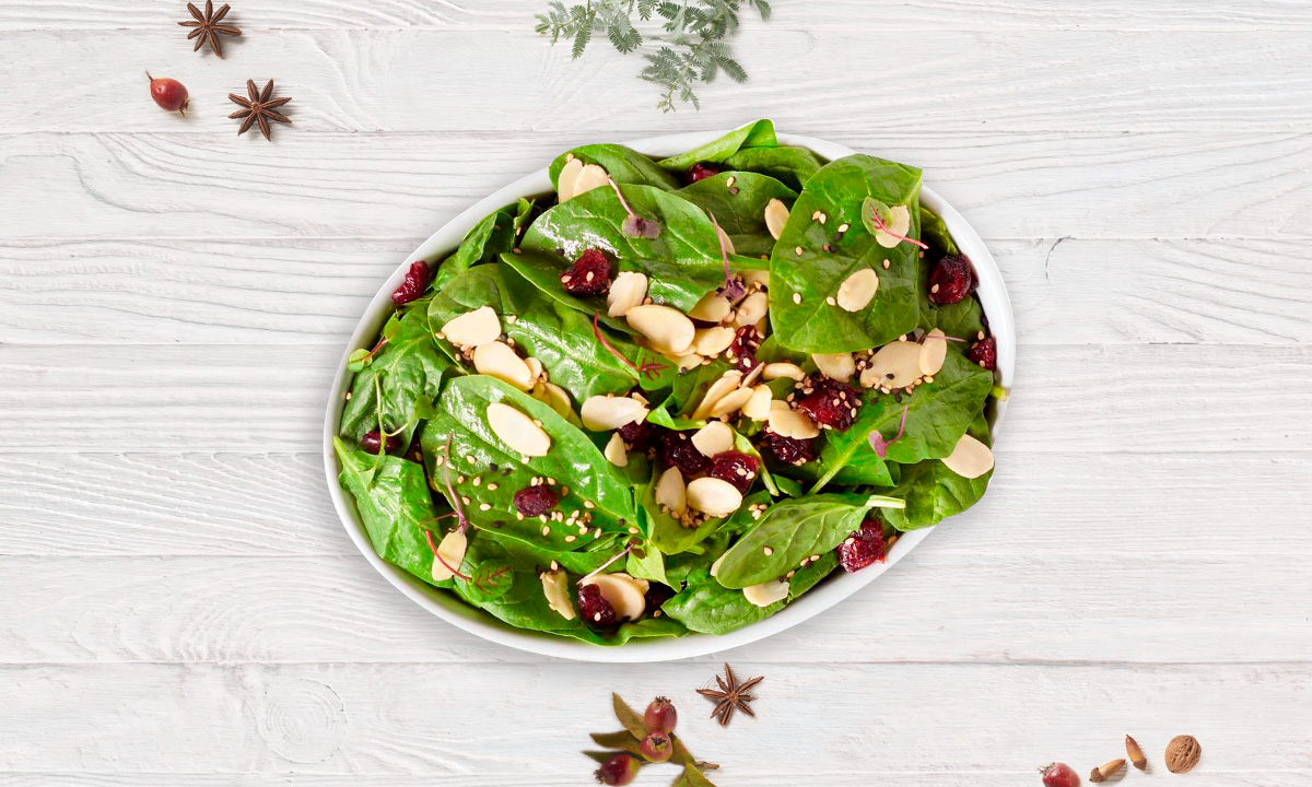 Ensalada de espinaca: Las cenas navideñas no son sinónimo de olvidar el balance, la opción: una ensalada de espinaca con almendra tostada, arándanos y ajonjolí que darán a cualquier platillo el toque saludable.