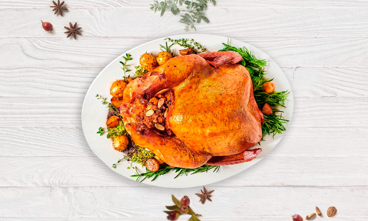 Pavo horneado: El clásico por excelencia, está relleno de deliciosa carne molida, especias y frutos secos e inyectado con vino blanco, que lo conserva siempre humectado, es un clásico que no puede faltar en la mesa.