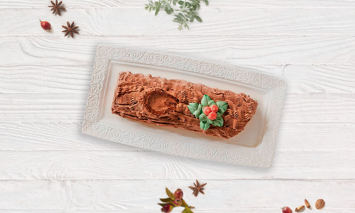 Tronco navideño de chocolate: Relleno de crema de mantequilla y chocolate, este delicioso postre te dejará un excelente sabor de boca.